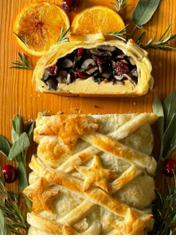 INGREDIENTS: 800g portobello mushrooms, 2 medium sized red onions, 2 garlic cloves, 15g dried wild mushrooms, 3 tbsp Mellow Turmeric Coconut Oil, 200ml Marsala wine, 1 tbsp balsamic vinegar, 1 tbsp truffle oil, 30g dried cranberries, 30g chestnuts, 800g puff pastry, milk to glaze, salt and pepper to taste.