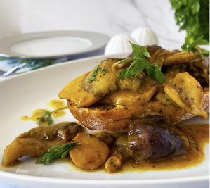 INGREDIENTS: 300g mushrooms (oyster, shiitake and king oyster are recommended but chestnut and portobello work just as well), 2 tbsp turmeric spiced cooking oil, 200ml coconut milk, 1 medium ciabatta (or 2 small ones), 2 garlic cloves, parsley to garnish, salt and pepper to taste.